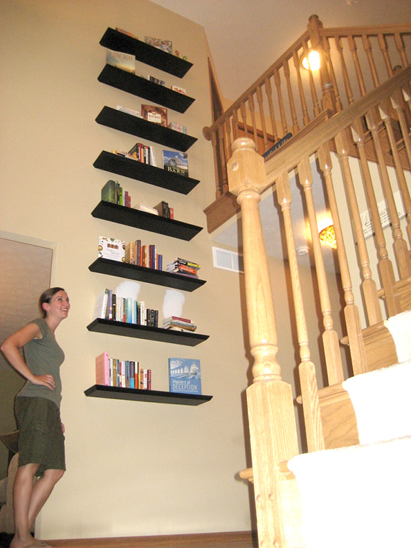 A crazy thought popped into my head one day while doing my daily doings. I was trying to figure out how to make the large open space of our foyer more enjoyable. I wanted a centerpiece for the area that would make people stop and say, “wow!” So I got the silly idea to make a two story bookshelf. I ran the idea by my lovely wife as a sort of, whatadayathink. She thought that it’d be pretty cool, and here she is in this picture modeling off the final product. So we did a quick guestimate to how many shelves we wanted and did a few browsings at the local diy stores for shelves and brackets. I did a test run at 3 shelves. And then next day I went out to get 3 more because of how cool it was looking. A week or two later and we were at 8. We planned 9 originally, but decided against the last one, thinking it would be too close to the ceiling.